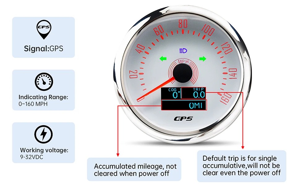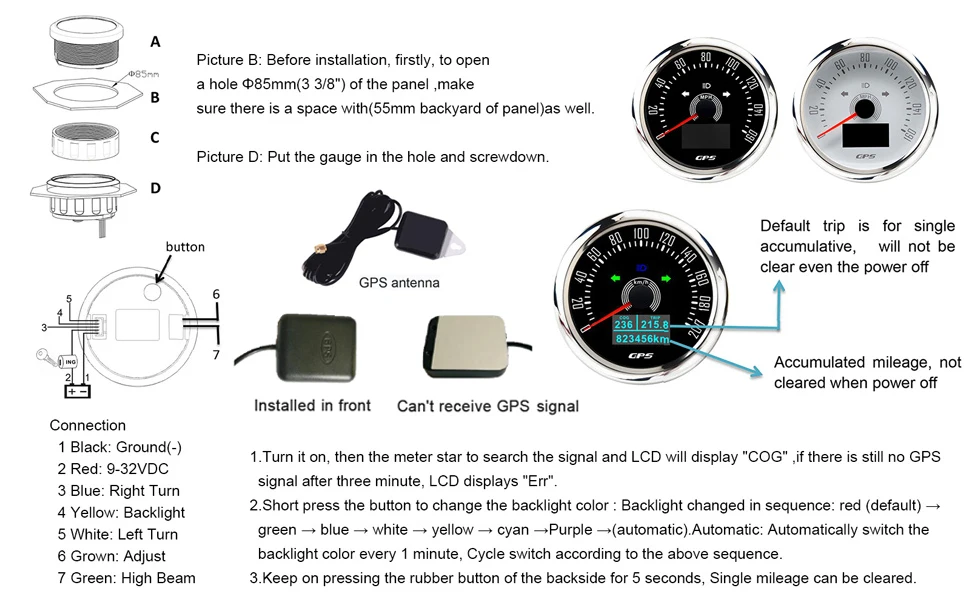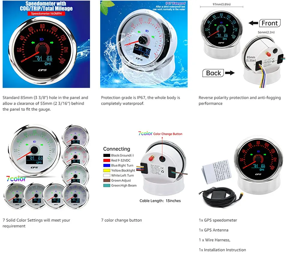 ??Function??7 Solid Color Settings will meet your requirement. You can switch color of light you like-Colors Include Blue. Red. Green. Teal. Purple. White & Yellow.??Function?? The GPS speedometer Install for 85mm(3 3/8"). Indicating range: 0-160MPH. TRIP: Short mileage(can be adjusted ). Total mileage: (can't be adjusted ). COG: Course Over Ground.??Wide Applicability?? Suitable for all vehicles Motorcycle/ Boat/Truck/Bus/Car and off-road vehicles. It gets quicker under a clear view of the sky. The signal comes directly from the satellite signal receiver(GPS Antenna). don't need other speed sensor.??Material??The boat GPS speedometer is made of Stainless Steel 316L Bezel and Anti-fog Glass. IP67 waterproof and dustproof grade. The marine speedometer has the advantages of high precision. quick location confirmation and short start up time.??After-Sale Guarantee??Included 1x GPS speedometer Gauge. 1x GPS Antenna. 1 x Wire Harness. 1x Installation Instruction. Please contact us if you are dissatisfied with our products. the response will be taken in 24 hours and provide proper solutions.Note: Products with electrical plugs are designed for use in the US. Outlets and voltage differ internationally and this product may require an adapter or converter for use in your destination. Please check compatibility before purchasing.
