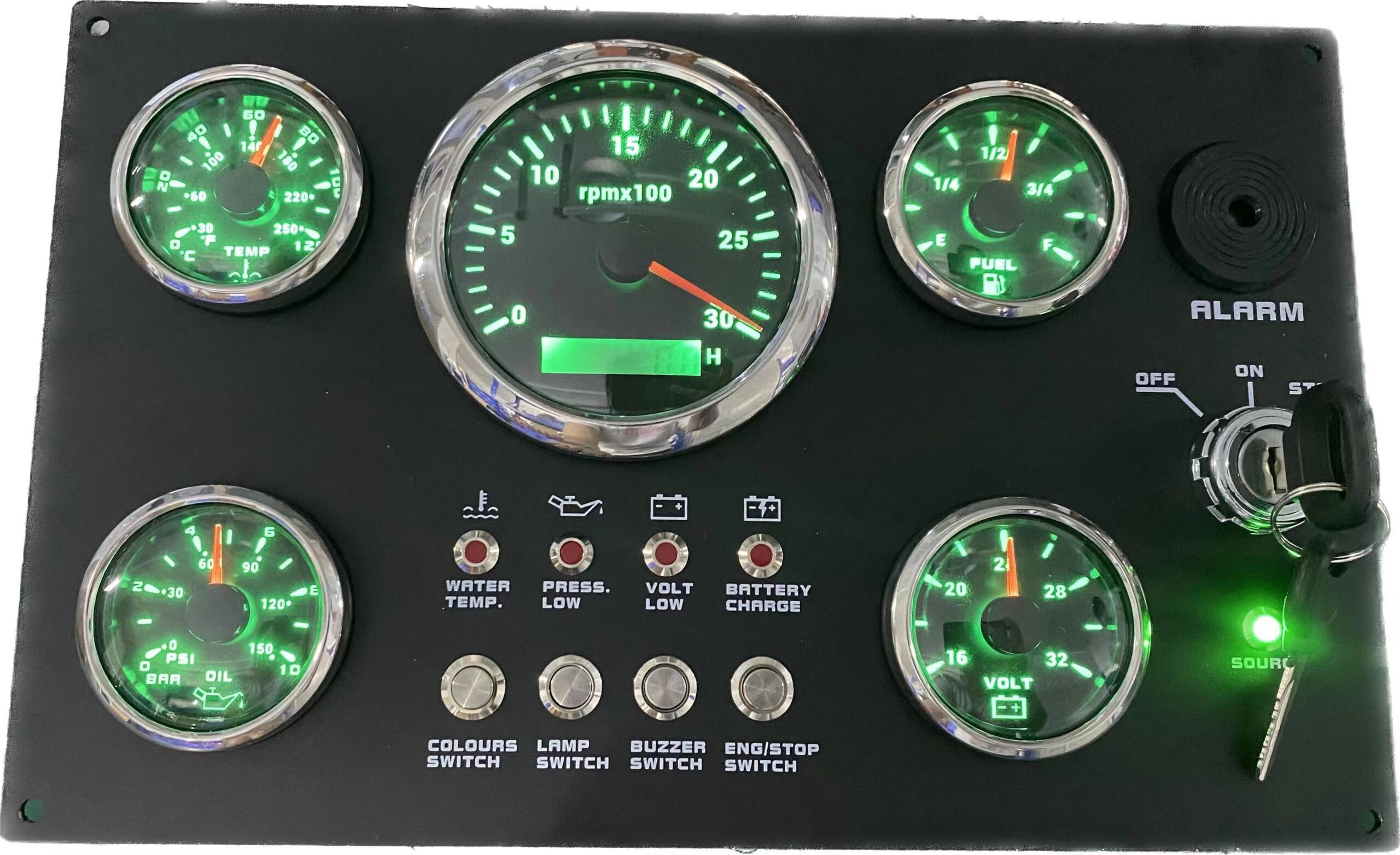 Features: | The gauge can be change: Tachometer with Digital Hour Meter:0-3000/4000/6000/7000/8000RPM Water Temperature gauge:40-120degree Oil Pressure gauge:0-5bar/0-10bar Volt meter:8-16V/16-32V Fuel Level gauge:0-190ohm/240-330hm Marine grade push button Switch (Engine Stop or Pre-heat) Marine grade Ignition key Sealed Key Switch. 4-position With Anti-restart 10A at 12V Four positions: Accessory – Off – Ignition/Accessory – Start. Spring return to Off. Key switch is constructed from engineering thermoplastic and is fully sealed using O-rings and ultrasonic welding to protect switch to ip67 (with connector installed). Plastic face nut and nickel-plated brass backing nut. Supplied with two matching keys. and with protective key boot. 2 tone Alarm Pizzo Siren |