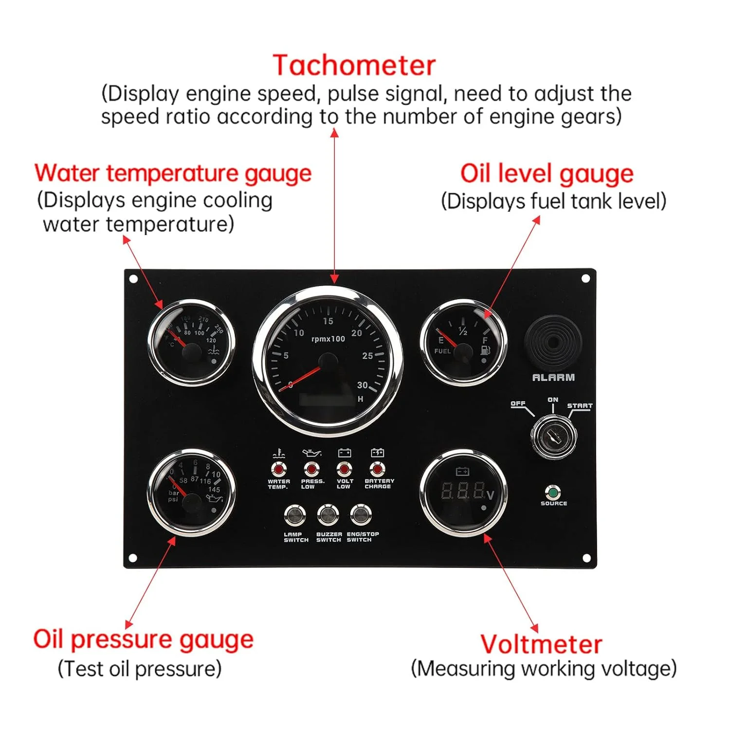 Features: | The gauge can be change: Tachometer with Digital Hour Meter:0-3000/4000/6000/7000/8000RPM Water Temperature gauge:40-120degree Oil Pressure gauge:0-5bar/0-10bar Volt meter:8-16V/16-32V Fuel Level gauge:0-190ohm/240-330hm Marine grade push button Switch (Engine Stop or Pre-heat) Marine grade Ignition key Sealed Key Switch. 4-position With Anti-restart 10A at 12V Four positions: Accessory – Off – Ignition/Accessory – Start. Spring return to Off. Key switch is constructed from engineering thermoplastic and is fully sealed using O-rings and ultrasonic welding to protect switch to ip67 (with connector installed). Plastic face nut and nickel-plated brass backing nut. Supplied with two matching keys. and with protective key boot. 2 tone Alarm Pizzo Siren |