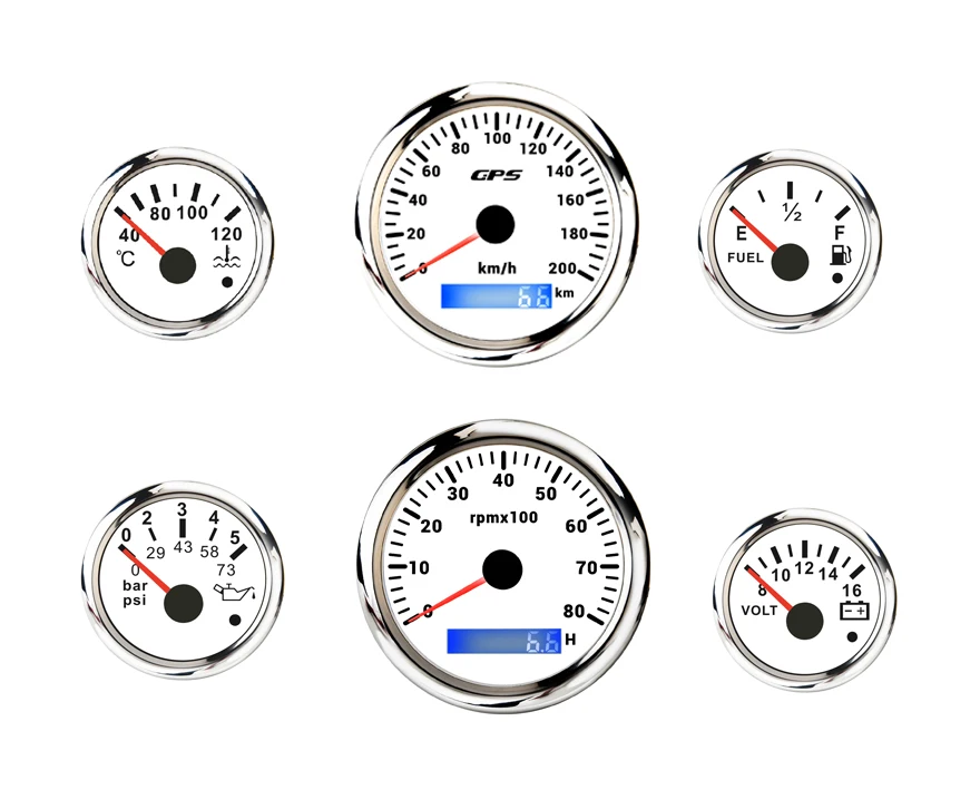 1.316L stainless steel for long-term use even in acid-base. humid environment .2.IP67 waterproof and dustproof grade3.Stepper motors used for full range of stepping gauges. great feature with its less power consumption. longer life. higher precision. etc.4.With curved glass (with anti-fog function)5.With ultra-wide working voltage design( long-term operating voltage: 9-32V. Maximum up to: 36V (≤ 1 minute)).6.Backlight for standard is red(Gauge with multi-color LED light of back-lit illumination (red. yellow. green. blue. purple. white). but various back light could be customized according to customer's requirement.7.Ultra-low power design— The working current of most of the instruments is about 40mA8.Customized color for stainless steel is providedProducts can be used for the engines/generating units. ships. construction machinery. agricultural machinery. automotive modification. etc.