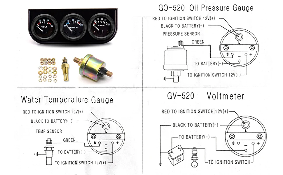??Multi-function kit??The 3-in-1 kit from left to right are voltmeter. oil pressure gauge. water temperature gauge. it constantly monitors the value changes of oil and water temperature to ensure driving safety.??Material??The black dial shell is made of ABS and metal material. durable and strong. Numbers and pointer clearly show; The dial has an illuminating devicel for easy reading in the darkness.??Wide Applicability??Applicable to most 12V cars. High sensitivity and easy operation. It can be used in place of. or in addition to. presently operating indicator lights. Gauge insures greater accuracy and provide a wider margin of safety than indicator lights.??Package Included??1 x Volt Meter+Water Temp+Oil Pressure Meter Gauge .1 x three hole gauge bracket .1 x sensor. 1 x 1/8" NPT sensor thread. 1 x installation instructions.Easy installation. suitable for professional use.??After-Sale Guarantee??Please contact us if you are dissatisfied with our products. the response will be taken in 24 hours and provide proper solutions.Note: Products with electrical plugs are designed for use in the US. Outlets and voltage differ internationally and this product may require an adapter or converter for use in your destination. Please check compatibility before purchasing.