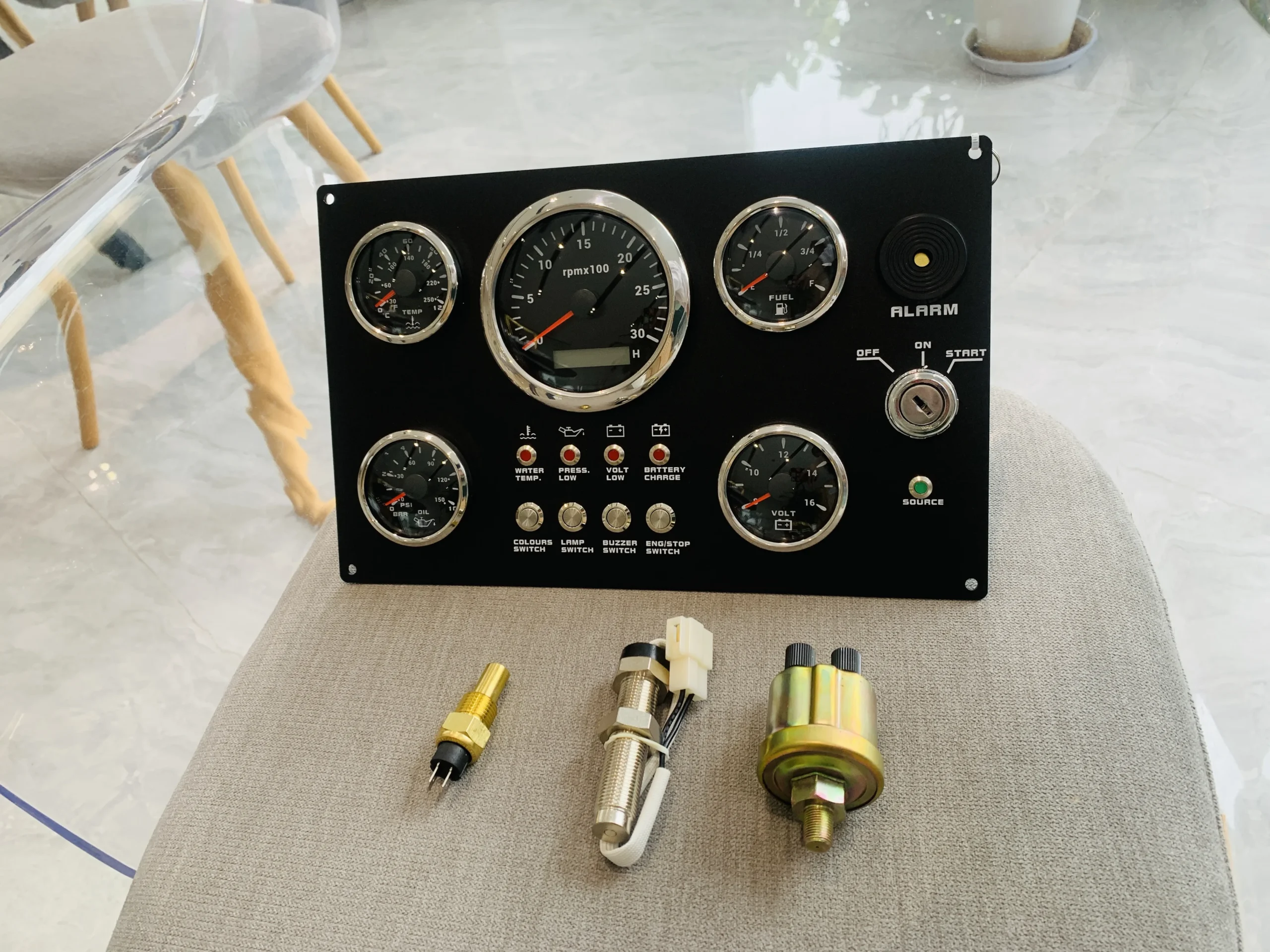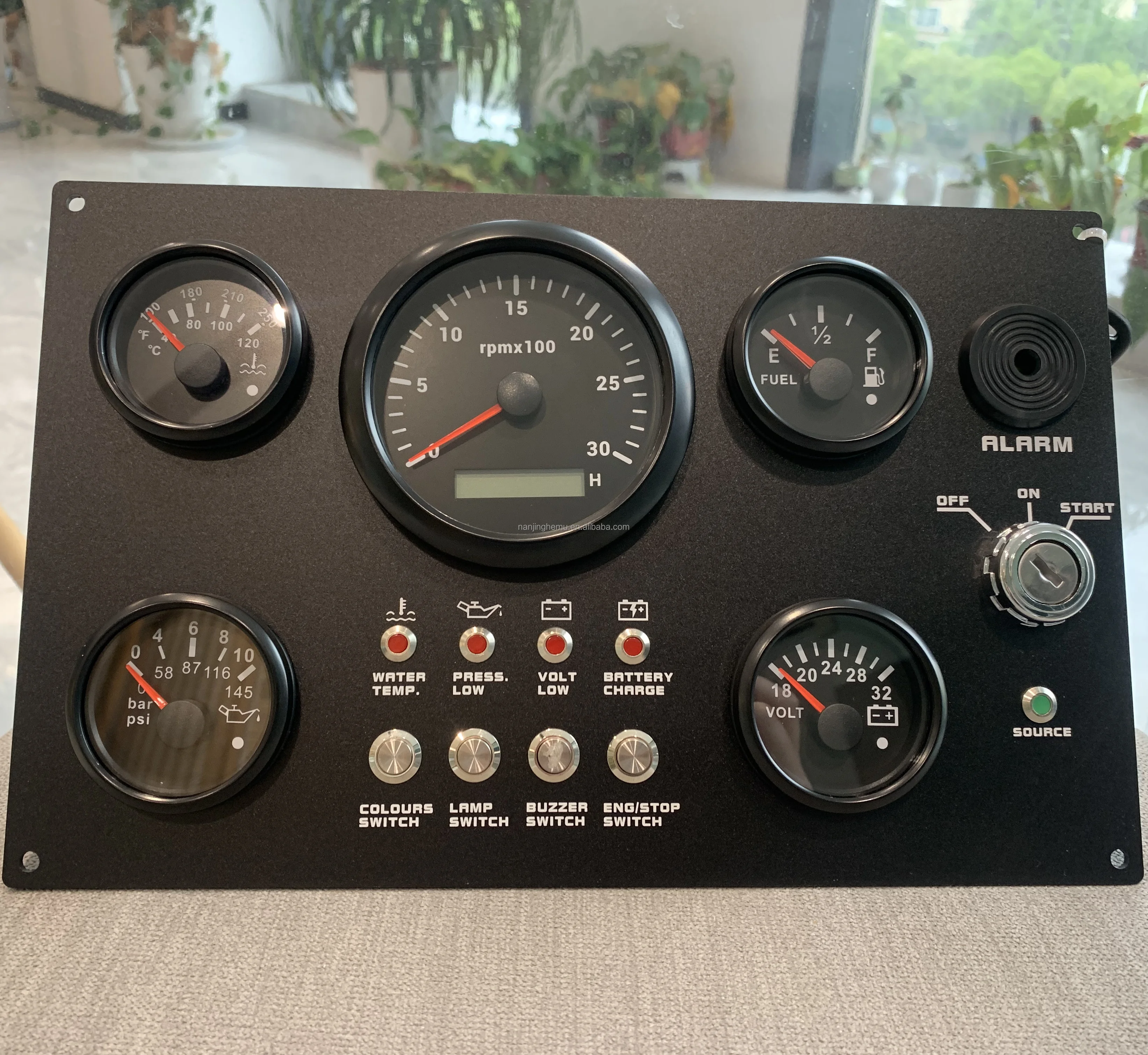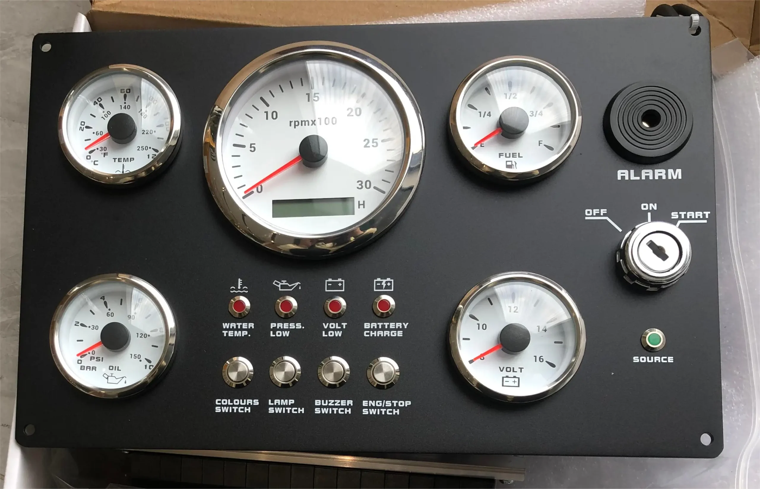 Features: | The gauge can be change: Tachometer with Digital Hour Meter:0-3000/4000/6000/7000/8000RPM Water Temperature gauge:40-120degree Oil Pressure gauge:0-5bar/0-10bar Volt meter:8-16V/16-32V Fuel Level gauge:0-190ohm/240-330hm Marine grade push button Switch (Engine Stop or Pre-heat) Marine grade Ignition key Sealed Key Switch. 4-position With Anti-restart 10A at 12V Four positions: Accessory – Off – Ignition/Accessory – Start. Spring return to Off. Key switch is constructed from engineering thermoplastic and is fully sealed using O-rings and ultrasonic welding to protect switch to ip67 (with connector installed). Plastic face nut and nickel-plated brass backing nut. Supplied with two matching keys. and with protective key boot. 2 tone Alarm Pizzo Siren |