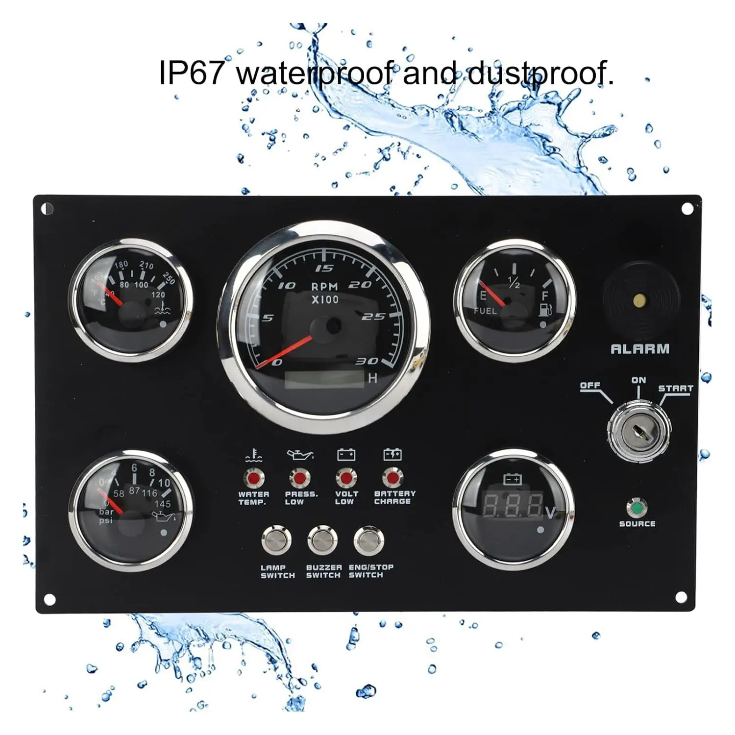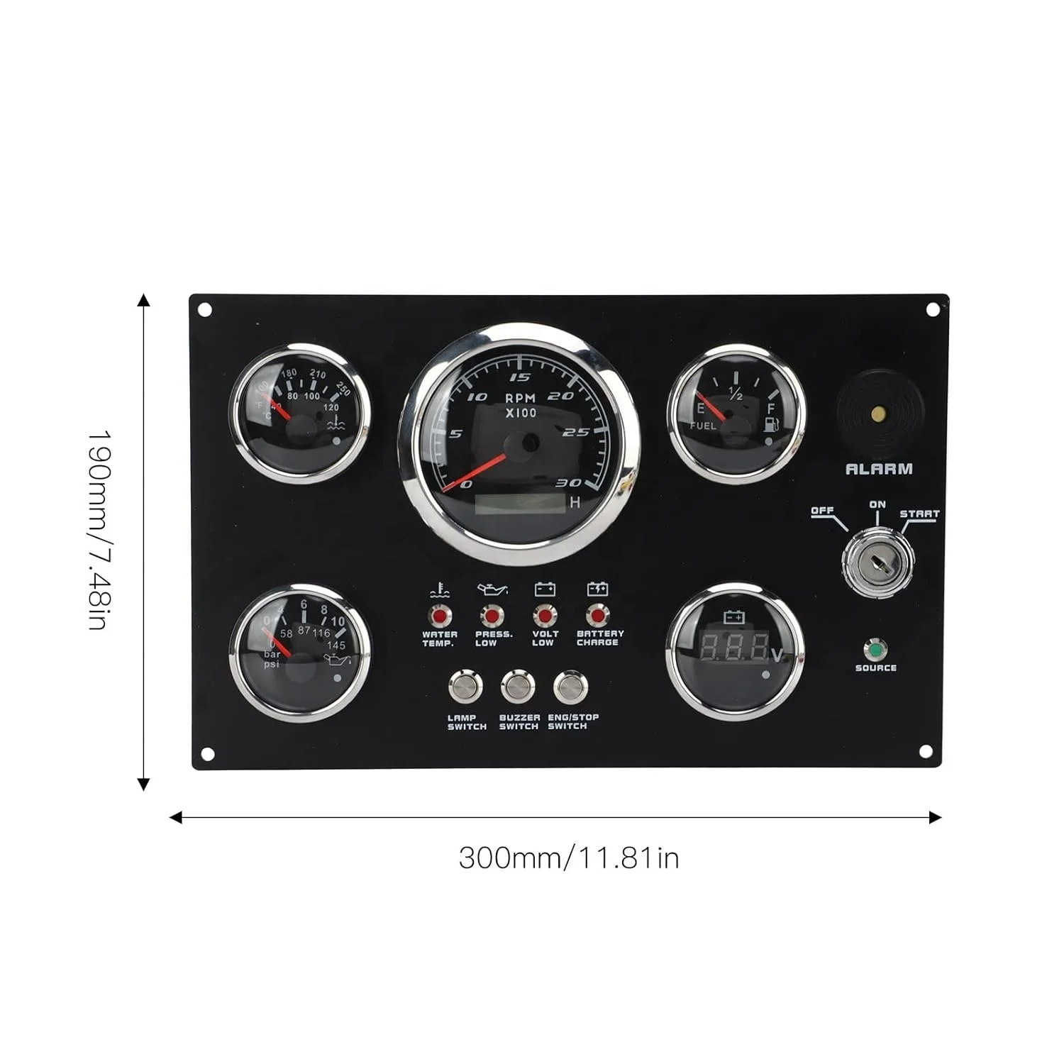 Features: | The gauge can be change: Tachometer with Digital Hour Meter:0-3000/4000/6000/7000/8000RPM Water Temperature gauge:40-120degree Oil Pressure gauge:0-5bar/0-10bar Volt meter:8-16V/16-32V Fuel Level gauge:0-190ohm/240-330hm Marine grade push button Switch (Engine Stop or Pre-heat) Marine grade Ignition key Sealed Key Switch. 4-position With Anti-restart 10A at 12V Four positions: Accessory – Off – Ignition/Accessory – Start. Spring return to Off. Key switch is constructed from engineering thermoplastic and is fully sealed using O-rings and ultrasonic welding to protect switch to ip67 (with connector installed). Plastic face nut and nickel-plated brass backing nut. Supplied with two matching keys. and with protective key boot. 2 tone Alarm Pizzo Siren |