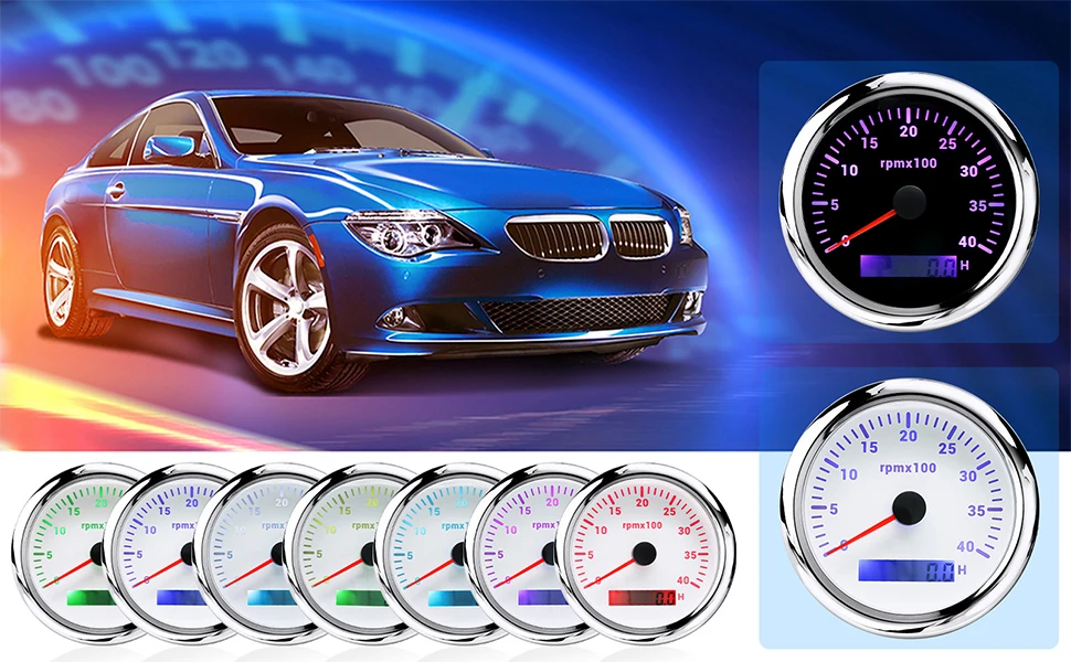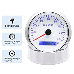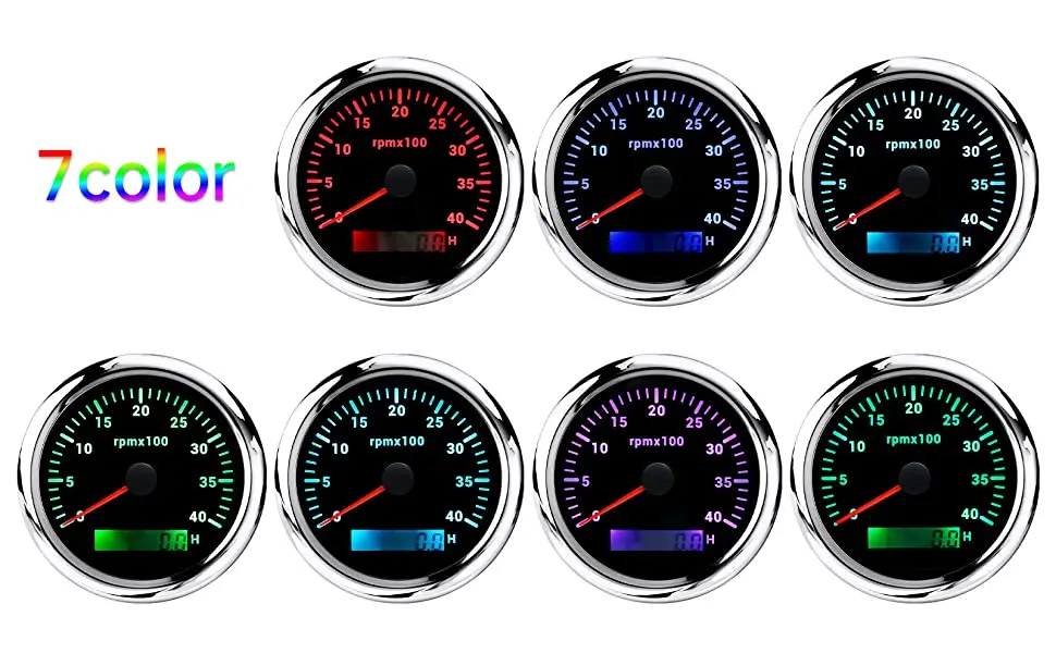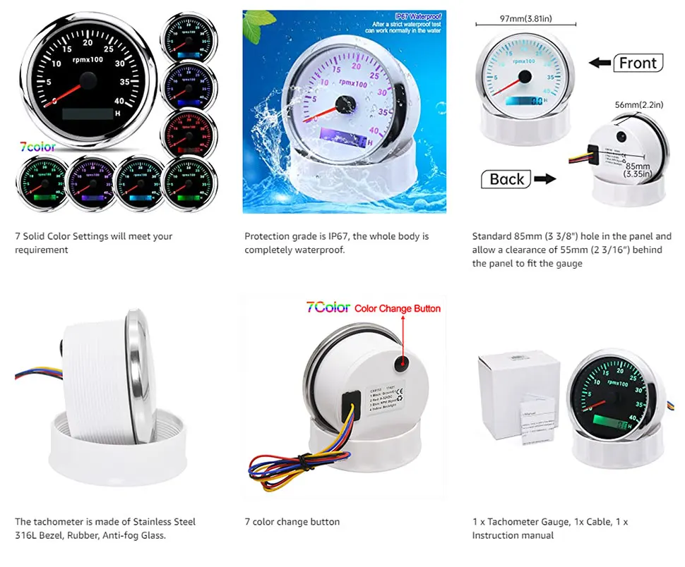 ??Function??7 Solid Color Settings will meet your requirement. The button on the lens can switch color of light you want-Colors Include Blue. Red. Green. Teal. Purple. White & Yellow. Smoked Tint lens when "off".Color LED Display when "on".??Material??85mm 3 3/8" tachometer made of 316 Stainless steel bezel with curved glass. Prevent fog on the glass surface. making it easy to see the instrument display. Red Illuminated needle. bright LED display during the night.??Range?? Tachometer reads from 0 to 4.000 RPM. Installs to any 4.6.8.10.12 Cylinder Gas Powered Engine for 9-32V vehicles.??Stability??Boat tachometer meter compatible for all kinds of tacho RPM sensors. and display the rotation speed of the engine.??After-Sale Guarantee??1 x Tachometer Gauge. 1x Cable. 1 x Instruction manual. Please contact us if you are dissatisfied with our products. the response will be taken in 24 hours and provide proper solutions.Note: Products with electrical plugs are designed for use in the US. Outlets and voltage differ internationally and this product may require an adapter or converter for use in your destination. Please check compatibility before purchasing.