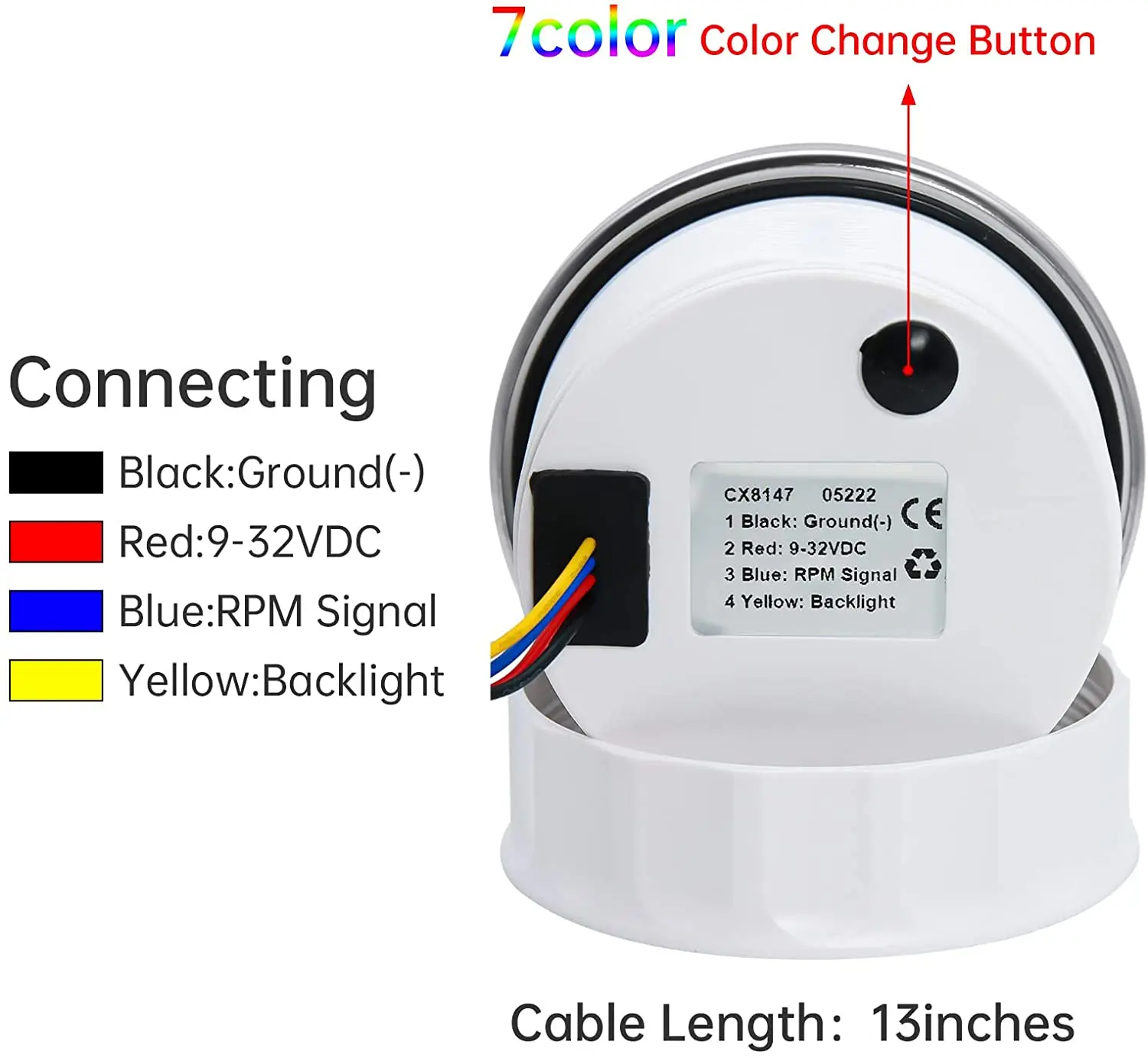 ??Function??7 Solid Color Settings will meet your requirement. The button on the lens can switch color of light you want-Colors Include Blue. Red. Green. Teal. Purple. White & Yellow. Smoked Tint lens when "off".Color LED Display when "on".??Material??85mm 3 3/8" tachometer made of 316 Stainless steel bezel with curved glass. Prevent fog on the glass surface. making it easy to see the instrument display. Red Illuminated needle. bright LED display during the night.??Range?? Tachometer reads from 0 to 4.000 RPM. Installs to any 4.6.8.10.12 Cylinder Gas Powered Engine for 9-32V vehicles.??Stability??Boat tachometer meter compatible for all kinds of tacho RPM sensors. and display the rotation speed of the engine.??After-Sale Guarantee??1 x Tachometer Gauge. 1x Cable. 1 x Instruction manual. Please contact us if you are dissatisfied with our products. the response will be taken in 24 hours and provide proper solutions.Note: Products with electrical plugs are designed for use in the US. Outlets and voltage differ internationally and this product may require an adapter or converter for use in your destination. Please check compatibility before purchasing.
