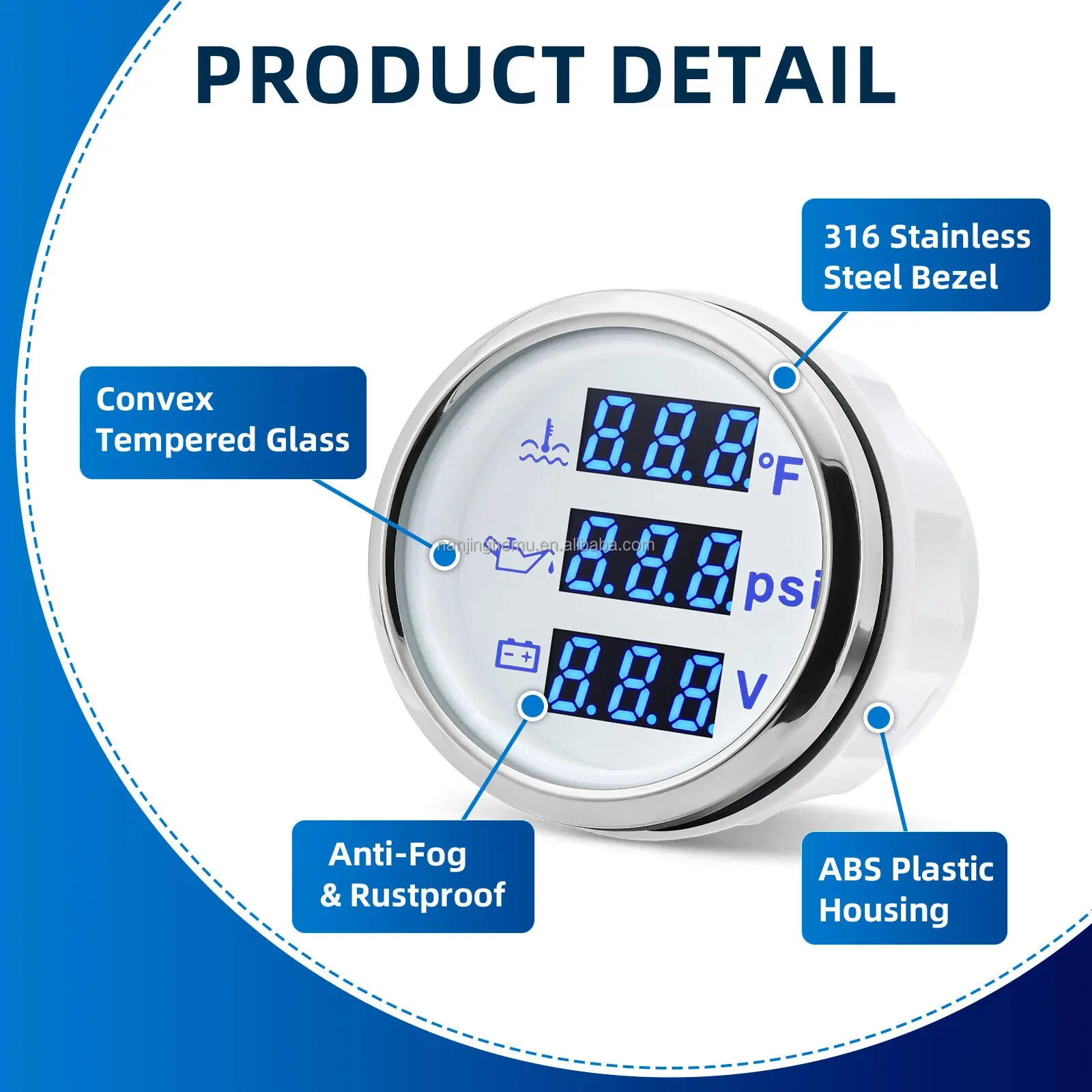 1.316L stainless steel for long-term use even in acid-base. humid environment .2.IP67 waterproof and dustproof grade3.Stepper motors used for full range of stepping gauges. great feature with its less power consumption. longer life. higher precision. etc.4.With curved glass (with anti-fog function)5.With ultra-wide working voltage design( long-term operating voltage: 9-32V. Maximum up to: 36V (≤ 1 minute)).6.Backlight for standard is red(Gauge with multi-color LED light of back-lit illumination (red. yellow. green. blue. purple. white). but various back light could be customized according to customer's requirement.7.Ultra-low power design— The working current of most of the instruments is about 40mA8.Customized color for stainless steel is providedProducts can be used for the engines/generating units. ships. construction machinery. agricultural machinery. automotive modification. etc.